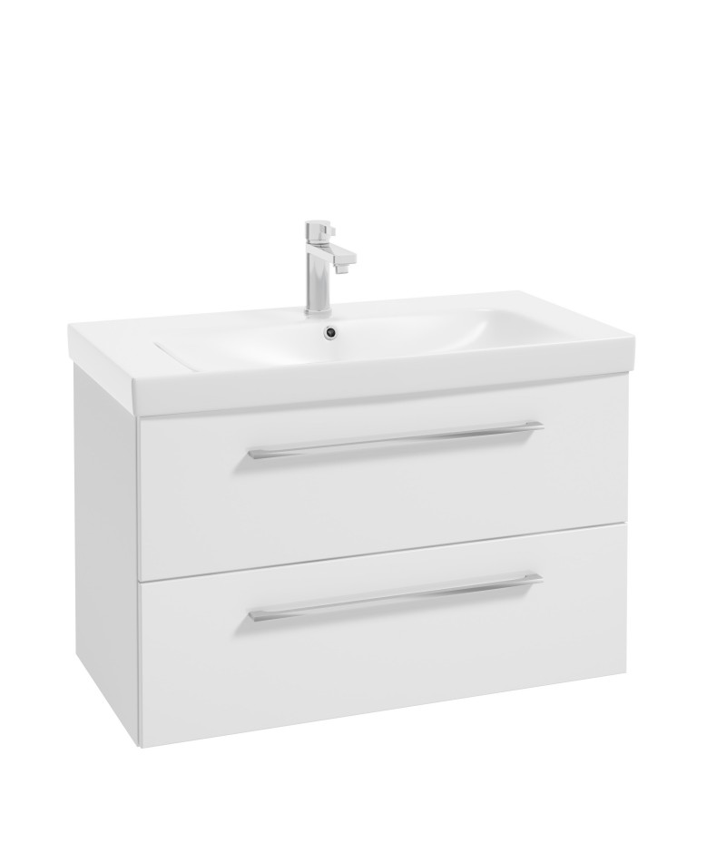 Szafka podumywalkowa podwieszana TRENTO D85, w białym błyszczącym kolorze lakieru, o szerokości 83,2 cm. Szafka posiada dwie głębokie szuflady, wyposażone w system DefraPlatinium z funkcją cichego domykania DefraSoftClose, prowadnicami z pełnym wysuwem oraz estetycznymi grafitowymi ściankami bocznymi i praktyczny organizer na akcesoria łazienkowe, powalający utrzymać porządek w szufladzie. Szafka wykonana jest z materiałów wysokiej jakości, front i korpus są lakierowane, odporne na promieniowanie UV. Szafka wyposażona jest w smukłe metalowe uchwyty spójne z linią mebli. Szafka doskonale wygląda z dedykowaną umywalką ROMA.
