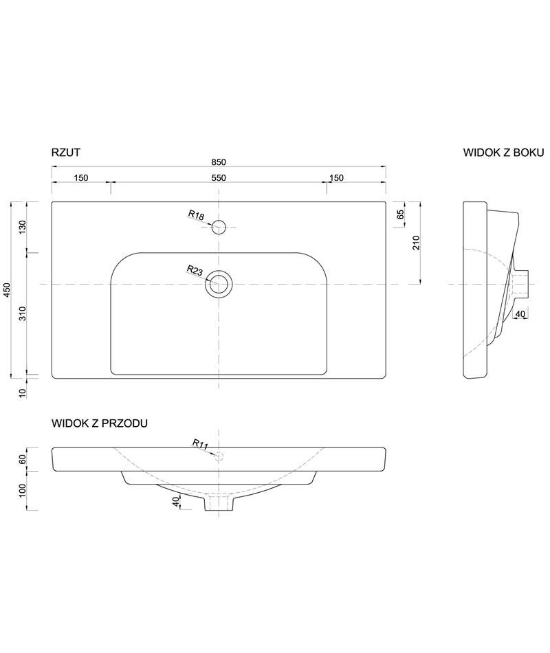 Umywalka ceramiczna ROMA 85, o szerokości 85 cm i głębokości 45 cm, z systemem samopoziomującym, o kwadratowym kształcie.