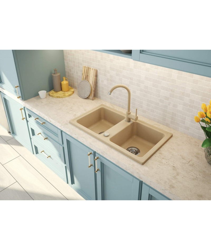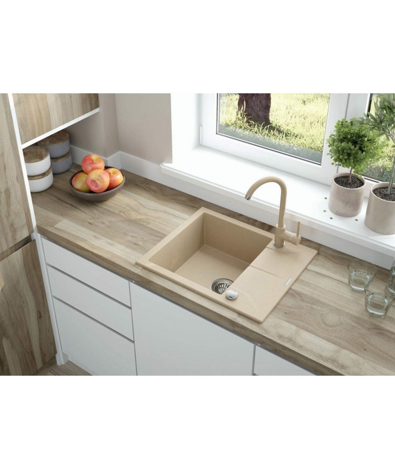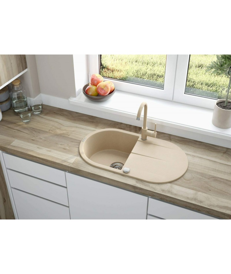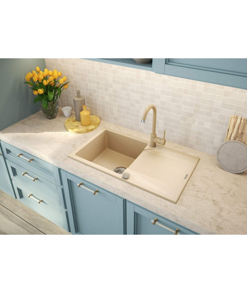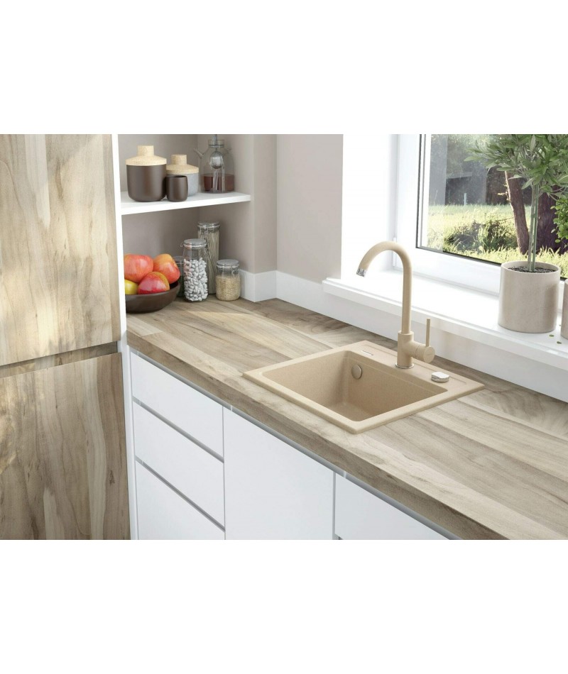 Wygodna, wysoka bateria kuchenna o jasnej kolorystyce jest doskonale dopasowana do granitowych, piaskowych zlewozmywaków. Jest to cicha bateria zaopatrzona w wydajny system napowietrzający wodę. Jest to rozwiązanie zarówno ekonomiczne, jak i ekologiczne, gdyż oszczędza środowisko i pieniądze. Charakterystyczny wygląd wylewki i jej wysokość czynią ją wygodną w użytkowaniu. Łatwo jest operować pod nią nawet wysokimi naczyniami lub umyć na przykład mniej foremną blachę z piekarnika. Świetna jakość materiałów użytych do produkcji sprawiają, że bateria kuchenna jest praktycznie bezawaryjna. Jasny, piaskowy kolor pasuje do przytulnych wnętrz o jasnej kolorystyce.
