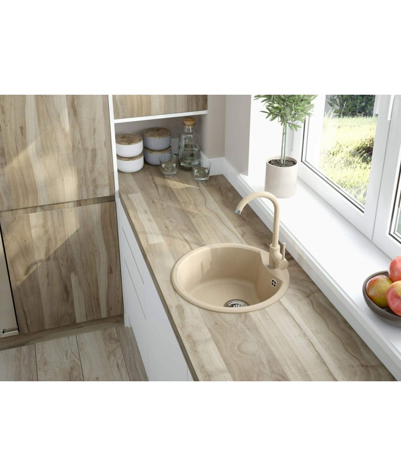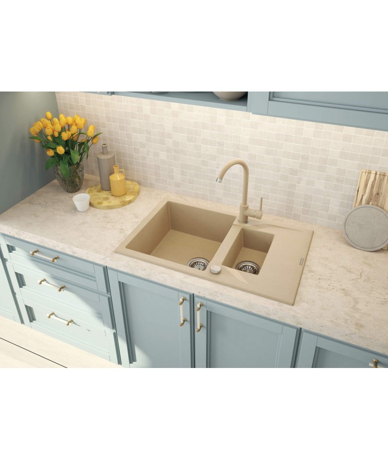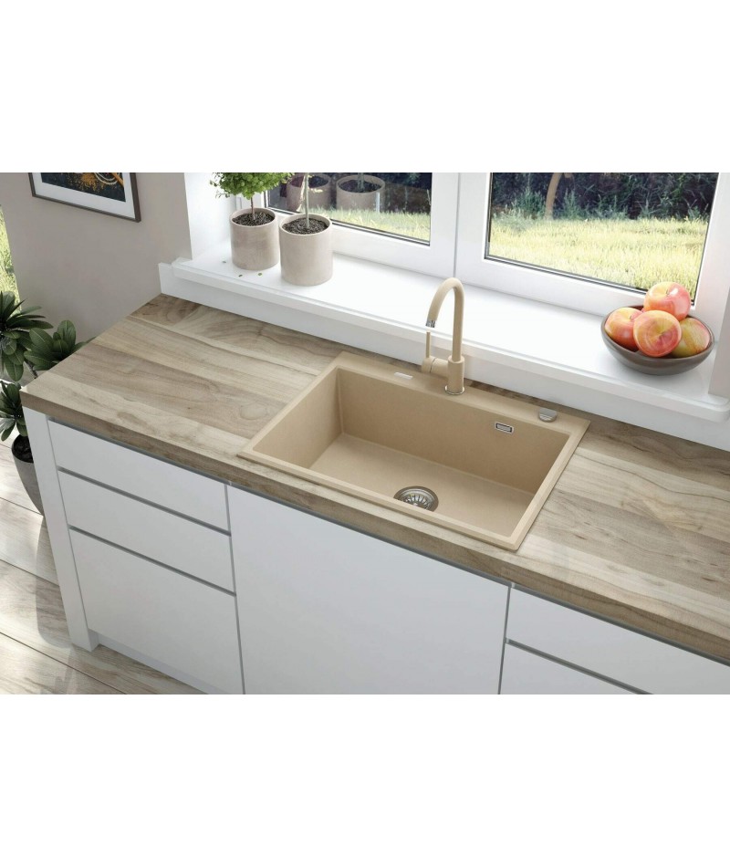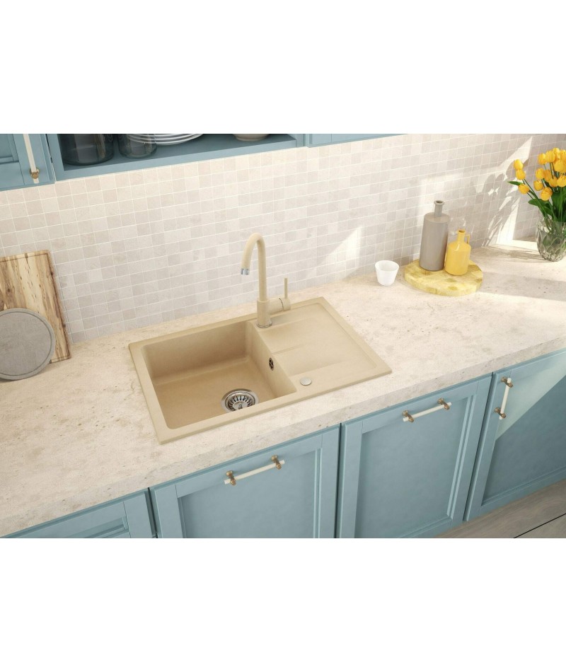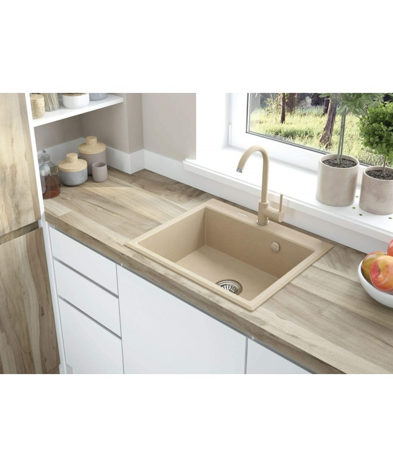 Wygodna, wysoka bateria kuchenna o jasnej kolorystyce jest doskonale dopasowana do granitowych, piaskowych zlewozmywaków. Jest to cicha bateria zaopatrzona w wydajny system napowietrzający wodę. Jest to rozwiązanie zarówno ekonomiczne, jak i ekologiczne, gdyż oszczędza środowisko i pieniądze. Charakterystyczny wygląd wylewki i jej wysokość czynią ją wygodną w użytkowaniu. Łatwo jest operować pod nią nawet wysokimi naczyniami lub umyć na przykład mniej foremną blachę z piekarnika. Świetna jakość materiałów użytych do produkcji sprawiają, że bateria kuchenna jest praktycznie bezawaryjna. Jasny, piaskowy kolor pasuje do przytulnych wnętrz o jasnej kolorystyce.