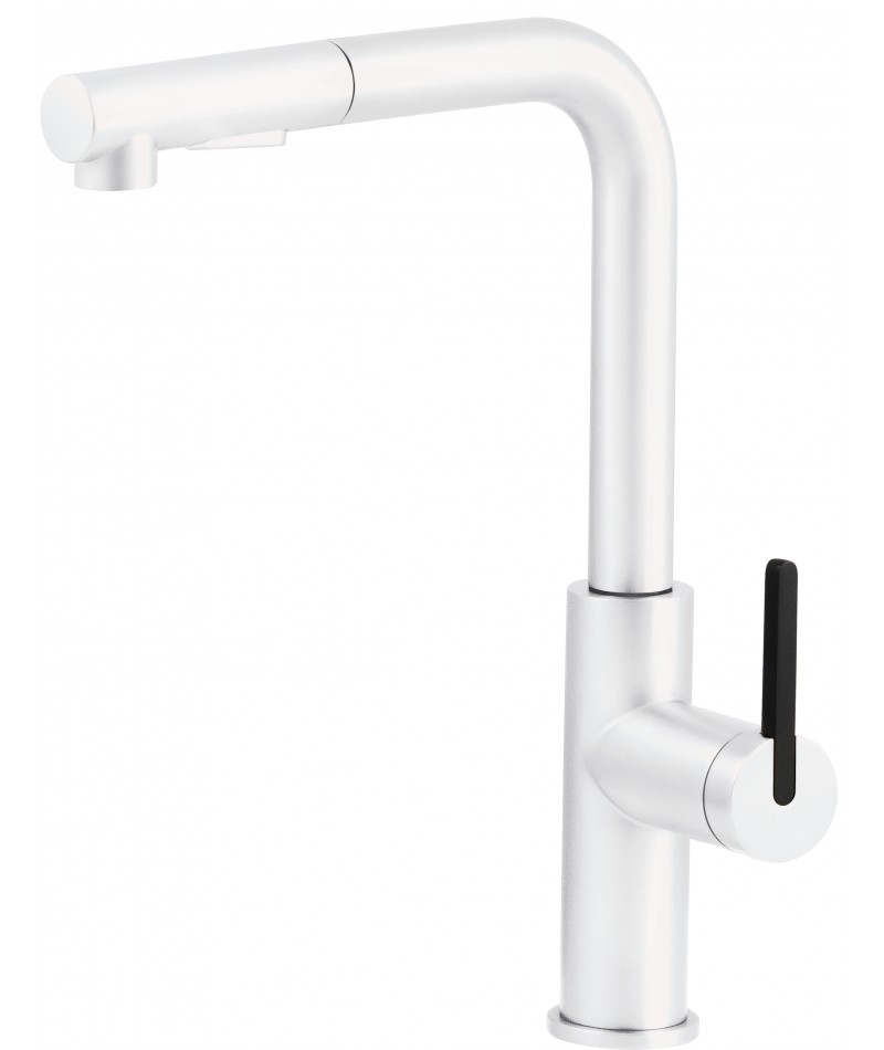Bateria Momi, stworzona z najwyższej jakości stali nierdzewnej, zachwyca swoim nowoczesnym, prostokątnym kształtem wylewki, która nadaje jej wyjątkowego charakteru. Wbudowany aerator napowietrza strumień wody, co pozwala efektywnie ograniczyć jej zużycie, nie tracąc przy tym na intensywności przepływu. Wyciągana wylewka zapewnia pełną swobodę ruchu, ułatwiając codzienne prace w kuchni, także te wymagające sięgnięcia w trudno dostępne miejsca. Do dyspozycji są dwa rodzaje strumienia – delikatny, napowietrzony idealny do mycia oraz miękki, deszczowy, perfekcyjny do płukania warzyw i owoców. Całość dopełnia eleganckie, matowe białe wykończenie, które wprowadza do kuchni subtelną elegancję i nowoczesną lekkość.