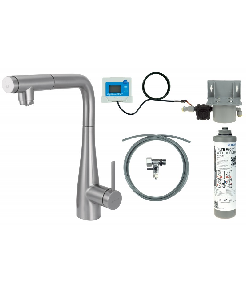 Bateria kuchenna z systemem filtracji wody Eridan to wyjątkowe rozwiązanie, które łączy elegancję, funkcjonalność i troskę o zdrowie. Smukła forma baterii, wykończona w szczotkowanej stali, nadaje kuchni wyjątkowego charakteru. Subtelnie rozszerzający się ku dołowi korpus sprawia, że całość prezentuje się lekko i harmonijnie.To jednak coś więcej niż bateria – dzięki wbudowanemu systemowi filtracji Eridan staje się źródłem czystej i zdrowej wody. Wystarczy nacisnąć przycisk Click umieszczony na wylewce, aby jednym ruchem przełączyć się na wodę filtrowaną, dostarczaną oddzielnym wężykiem bezpośrednio z filtra. Takie rozwiązanie nie tylko eliminuje potrzebę stosowania dodatkowych dzbanków czy butelek, ale także pozwala zadbać o środowisko, ograniczając zużycie plastiku.Dołączony zestaw filtracyjny skutecznie usuwa chlor, metale ciężkie, piasek i inne zanieczyszczenia, poprawiając smak oraz zapach wody. Dzięki temu możesz bez obaw podawać ją rodzinie, używać do gotowania czy przygotowywania napojów. Praktyczny monitor wskazuje, kiedy należy wymienić wkład filtracyjny, co gwarantuje stałą jakość wody na co dzień. Montaż całego systemu jest szybki i prosty, a codzienne korzystanie z niego – intuicyjne i wygodne.Eridan to nie tylko elegancki element wyposażenia kuchni, ale przede wszystkim inwestycja w zdrowie i komfort. Łączy nowoczesną estetykę z ekologicznym podejściem i dbałością o detale, sprawiając, że Twoja kuchnia staje się miejscem jeszcze bardziej funkcjonalnym i wyjątkowym.