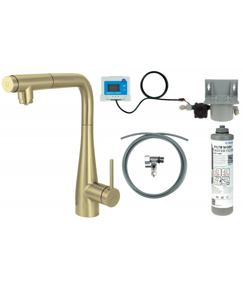 Bateria kuchenna z systemem filtracji wody Eridan to wyjątkowe rozwiązanie, które łączy elegancję, funkcjonalność i troskę o zdrowie. Smukła forma baterii, wykończona w szczotkowanym złocie, nadaje kuchni wyrafinowanego charakteru. Subtelnie rozszerzający się ku dołowi korpus sprawia, że całość prezentuje się lekko i harmonijnie.To jednak coś więcej niż bateria – dzięki wbudowanemu systemowi filtracji Eridan staje się źródłem czystej i zdrowej wody. Wystarczy nacisnąć przycisk Click umieszczony na wylewce, aby jednym ruchem przełączyć się na wodę filtrowaną, dostarczaną oddzielnym wężykiem bezpośrednio z filtra. Takie rozwiązanie nie tylko eliminuje potrzebę stosowania dodatkowych dzbanków czy butelek, ale także pozwala zadbać o środowisko, ograniczając zużycie plastiku.Dołączony zestaw filtracyjny skutecznie usuwa chlor, metale ciężkie, piasek i inne zanieczyszczenia, poprawiając smak oraz zapach wody. Dzięki temu możesz bez obaw podawać ją rodzinie, używać do gotowania czy przygotowywania napojów. Praktyczny monitor wskazuje, kiedy należy wymienić wkład filtracyjny, co gwarantuje stałą jakość wody na co dzień. Montaż całego systemu jest szybki i prosty, a codzienne korzystanie z niego – intuicyjne i wygodne.Eridan to nie tylko elegancki element wyposażenia kuchni, ale przede wszystkim inwestycja w zdrowie i komfort. Łączy nowoczesną estetykę z ekologicznym podejściem i dbałością o detale, sprawiając, że Twoja kuchnia staje się miejscem jeszcze bardziej funkcjonalnym i wyjątkowym.