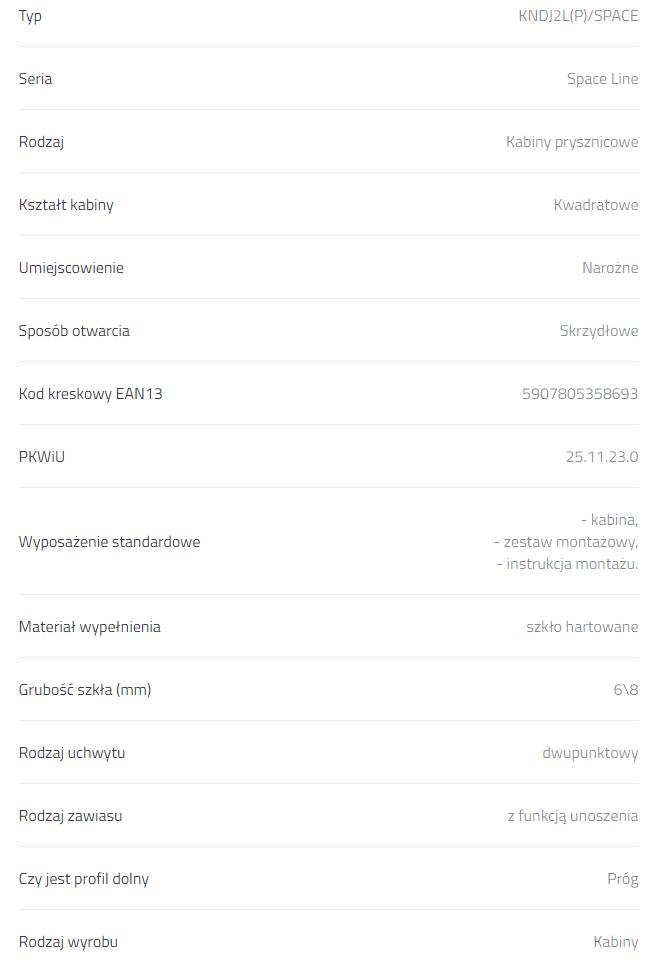 powierzchni użytkowania. Kabina narożna z drzwiami jednoskrzydłowymi w tej serii zbudowana jest z połączenia 6 i 8 mm szkła hartowanego z modyfikacją powierzchni szkła Glass Protect. Unikalną stylistykę tych kabin dopełnia bardzo prosty design połączony z ekskluzywnymi akcentami. Stabilność konstrukcji Space Line zapewnia elegancki wspornik tworzący harmonijną całość z zastosowanymi detalami. Zamontowany jest on w linii drzwi, czyniąc kabinę ozdobą wnętrza łazienki. Dodatkowym atutem kabin jest mechanizm unoszenia drzwi. Wygodne otwieranie umożliwia stylowy, chromowany dwupunktowy uchwyt. Regulowane profile przyścienne pozwalają na zniwelowanie krzywizny ściany. Wszystkie te cechy zapewniają pełną wygodę podczas użytkowania oraz przyjemność podczas kąpieli. Kabina dostępna jest w wersji prawej i lewej, więc dobierając produkt do swojej przestrzeni kąpielowej, należy wziąć pod uwagę miejsce jego montażu.
