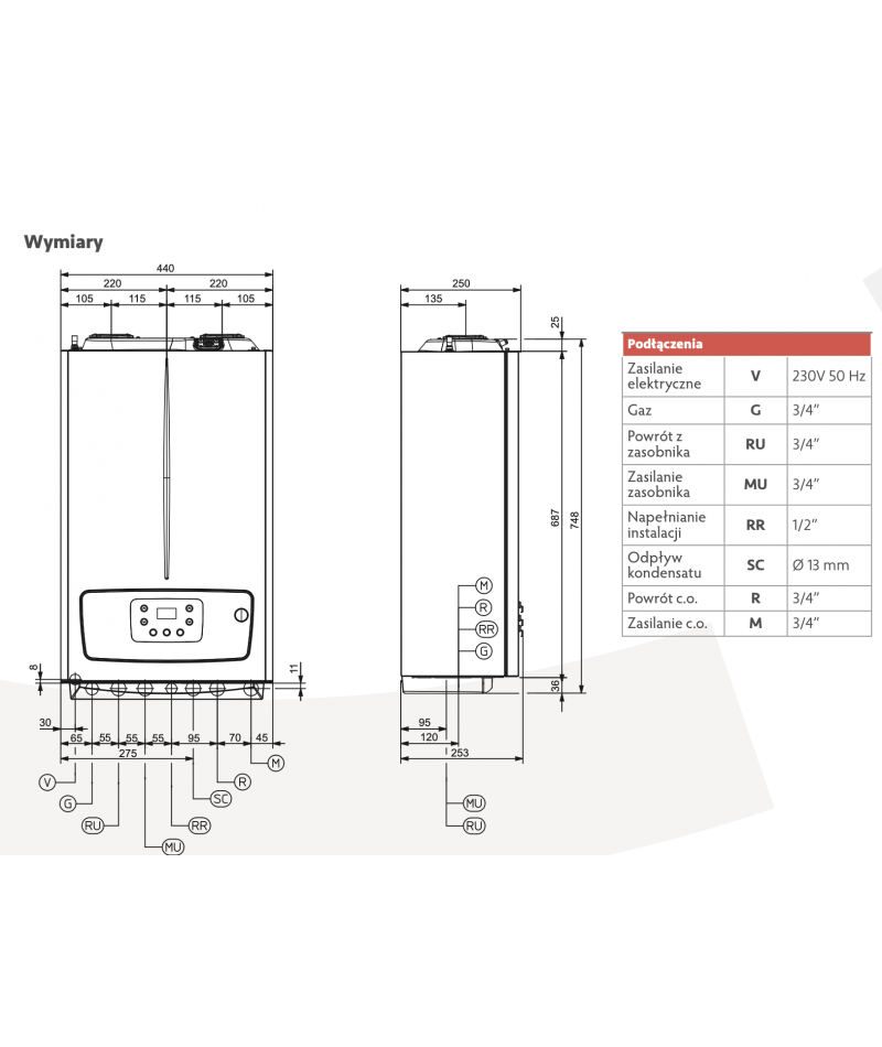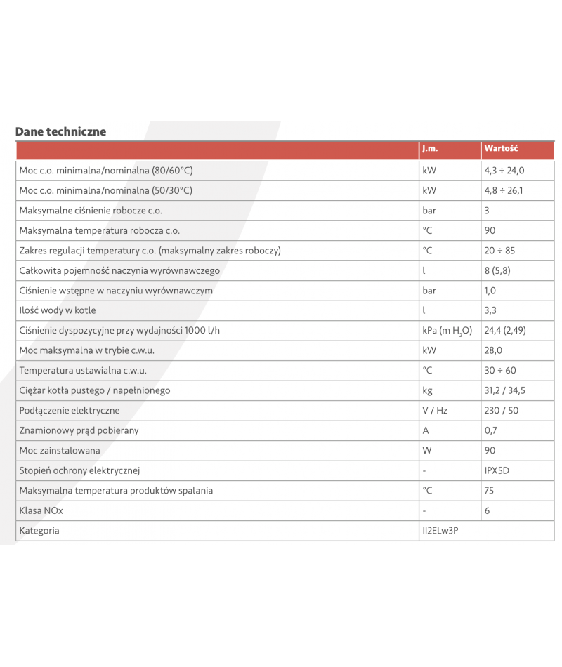 Kocioł gazowy kondensacyjny wiszący jednofunkcyjny (z możliwością podłączenia zewnętrznego zasobnika) z nowym wymiennikiem ze stali nierdzewnej w postaci jednorurowej wężownicy, przystosowany do zasilania gazem z dodatkiem 20% wodoru z szerokim zakresem modulacji mocy: moc c.o.: 4,3 ÷ 24,0 kW moc c.w.u.: 4,3 ÷ 28,7 kW i kompaktowymi wymiarami.