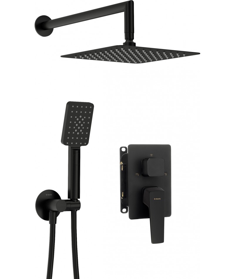 Nowoczesny zestaw prysznicowy z montażem podtynkowym zapewnia komfort codziennej kąpieli i estetyczny wygląd łazienki. W skład kompletu wchodzą: BOX mieszaczowy z 3-funkcyjnym przełącznikiem, deszczownia o średnicy 25 cm, słuchawka natryskowa z uchwytem oraz wąż.Duża deszczownia otula równomiernym strumieniem wody, sprzyjając relaksowi, a słuchawka z trzema trybami natrysku – deszczowym, hydromasażu i mieszanym – pozwala dopasować kąpiel do aktualnych potrzeb. System anti-calc ułatwia utrzymanie elementów w czystości, a wąż z zabezpieczeniem anti-twist zwiększa wygodę użytkowania.Całość wykończona jest elegancką, czarną matową powłoką, która podkreśla nowoczesny charakter wnętrza i sprawdzi się w każdej stylowej łazience.