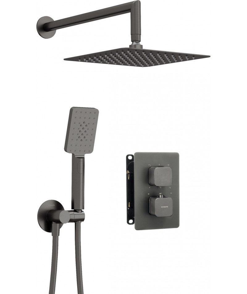 Zestaw prysznicowy podtynkowy to połączenie nowoczesnej technologii i ponadczasowej estetyki. W jego skład wchodzi precyzyjna bateria termostatyczna, prostokątna głowica natryskowa oraz słuchawka z przyjemnym, deszczowym strumieniem wyposażona w system Anti‑calc, który skutecznie ogranicza osadzanie się kamienia. Wybierając kompletny zestaw, zyskujesz pewność, że wszystkie elementy idealnie do siebie pasują i tworzą spójną całość.Montaż podtynkowy gwarantuje maksymalny minimalizm i wizualny porządek w strefie prysznica, a wykończenie w kolorze titanium doskonale odnajdzie się zarówno w klasycznych, jak i nowoczesnych aranżacjach. To rozwiązanie, które łączy funkcjonalność, komfort i estetykę na najwyższym poziomie.