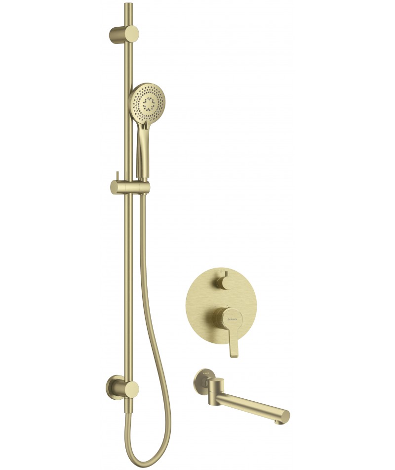 Komplet podtynkowy Arnika wykończony jest z eleganckim, szczotkowanym złocie. Jednouchwytowa bateria natryskowa charakteryzuje się prostą, wygodną dźwignią i mechanicznym przełącznikiem natrysku, który umożliwia przełączenie źródła wody między wylewką a słuchawką prysznicową nawet przy małym ciśnieniu. Składana wylewka to bardzo wygodny produkt. Podczas kąpieli, po napełnieniu wanny wodą, należy złożyć ją równolegle do ściany, zyskując tym samym komfort kąpieli. Słuchawka prysznicowa z wężem umocowana jest na eleganckim drążku. Mosiężny uchwyt słuchawki można przesuwać do dowolnej pozycji. Słuchawka prysznicowa posiada 3 funkcje strumienia: strumień deszczowy, hydromasaż i mieszany oraz system anti-calc, ułatwiający czyszczenie jej z osadu i kamienia. Geometryczne kształty kolekcji inspirowanej duńską ideą szczęścia pod hasłem hygge, pozwolą użytkownikom na stworzenie harmonijnych, współczesnych aranżacji, gwarantujących relaksujące chwile w zaciszu domowej łazienki.
